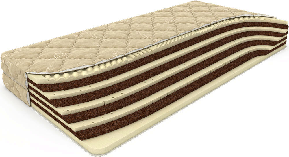 Основа матраса сделана из 4 слоев натуральной кокосовой койры и 3 слоев натурального латекса, что размещены поочередно. Эта конструкция обеспечивает определенную жесткость, необходимую данной модели, а с обеих сторон дополняется верхним слоем рельефного латекса с эффектом микромассажа, который является лучшим из современных наполнителей для матрасов. Способствует расслаблению и спокойному сну в комфортных для организма условиях.