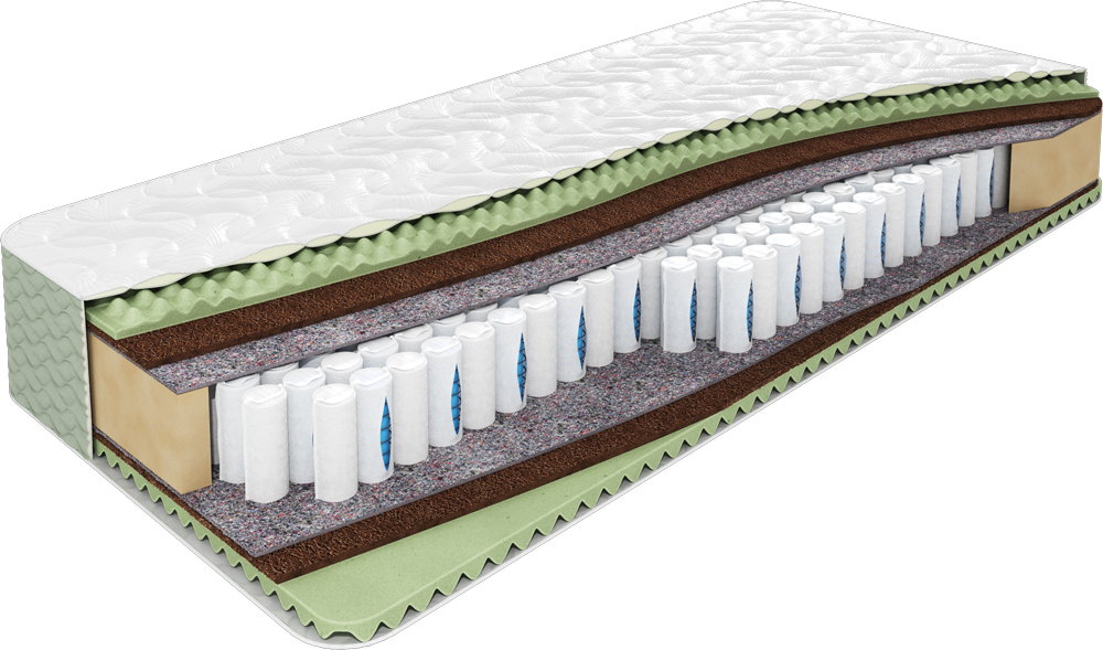 Матрас состоит из массажной пены ErgoFoam с обеих сторон, что обеспечивает расслабляющий массажный эффект во время сна. Дополнительно, кокосовый слой толщиной 1 см с обеих сторон придаёт матрасу необходимую жесткость. Внутри матраса расположен пружинный блок DS (это конструкция, в которой одна пружина находится внутри другой), которая подстраивается под вес обоих партнёров и не передаёт колебания от одного спящего к другому, даже если кто-то часто ворочается во сне. Чехол матраса выполнен из объемного простеганного трикотажа (ортопена), который придаёт приятные тактильные ощущения и хорошую воздухопроницаемость. Боковина из простеганной ткани букле добавляет элегантности и стиля.