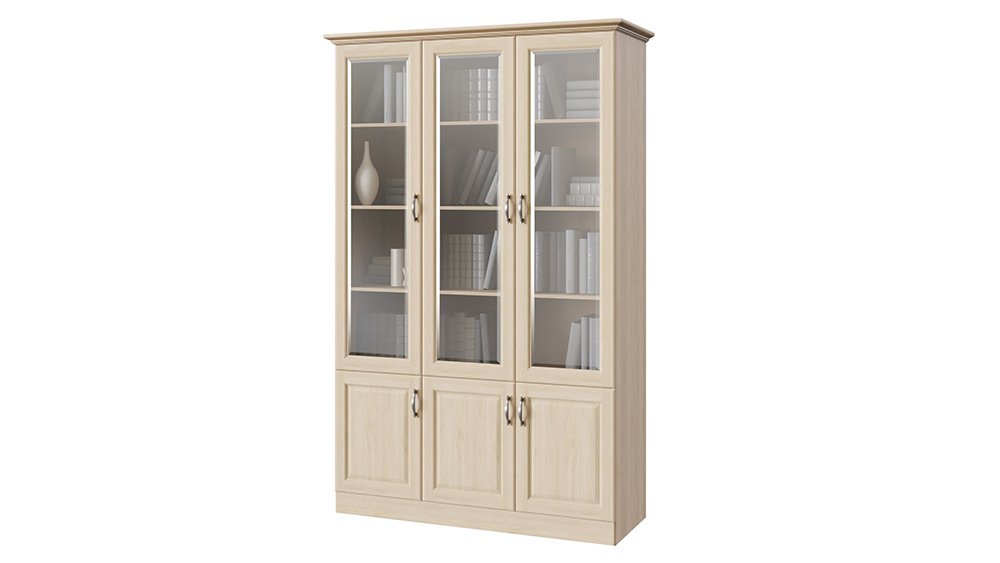 Трёхстворчатый шкаф библиотека коллекции Эдем в классическом стиле — это не только удобное место хранения, но и красивый предмет декора интерьера. Ведь на полках можно создать красивую композицию из книг с похожими по цвету обложками, интерьерными статуэтками или другими вещами, а через стеклянные дверки шкафа их будет хорошо видно, но при этом они будут защищены от попадания пыли. А в нижних ящиках шкафа можно удобно расположить документы и другие вещи, которые вам хотелось бы спрятать с видного места. Шкаф может быть выполнен полностью из натурального массива бука или ясеня или же, при желании немного удешевить изделие, мы можем изготовить боковины шкафа из ЛДСП. Обращаем ваше внимание, что такое решение никак не повлияет на визуальный вид товара. Внешние габариты библиотеки: 8 см. к ширине по внешним габаритам карниза. Требуется сборка.