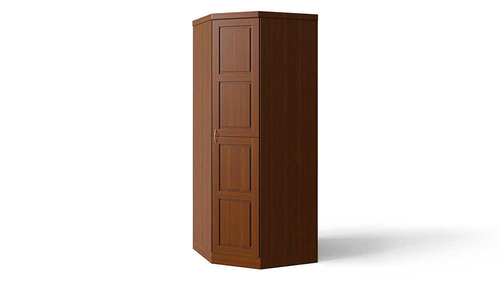 Угловой шкаф изготавливается с единым четырехсекционным фасадом. Шкаф с единой створкой идеально подходит для составления мебельных композиций в качестве углового модульного элемента. Фасады шкафа могут иметь встроенные зеркала, как на лицевой части фасада — по размеру филенчатой части, так и на внутренней стороне фасада. Распашная дверца шкафа оснащены петлями с системой до-закрытия в базовой комплектации. В верхней секции шкафа предусмотрена штанга для плечиков.