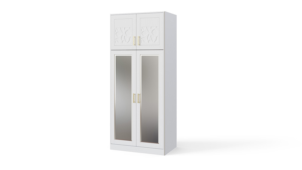 Шкаф производится с антресолью в верхней или нижней части шкафа, а также с двумя выкатными ящиками. В стандартном исполнении в большей створке - зеркало с фацетом, выполняет роль филенки в фасаде, по желанию возможна установка дверей из 100 % массива дерева. Корпус шкафа изготавливается только из массива бука или ясеня. Двухстворчатый шкаф – это достаточно вместительный элемент мебели спальни Веро. Авторская резьба на фасадах шкафа делает его произведением мебельного искусства. Распашные дверцы шкафа оснащены петлями с системой дозакрытия в базовой комплектации, а выкатные ящики – телескопическими направляющими. В большей секции шкафа предусмотрена штанга для плечиков. По желанию шкаф может быть оснащен любым количеством полок. Стандартно предусмотрено три комлектовки шкафа: с антресольной секцией вверху или внизу шкафа, а так-же с двумя выкатными ящиками. Требуется сборка.