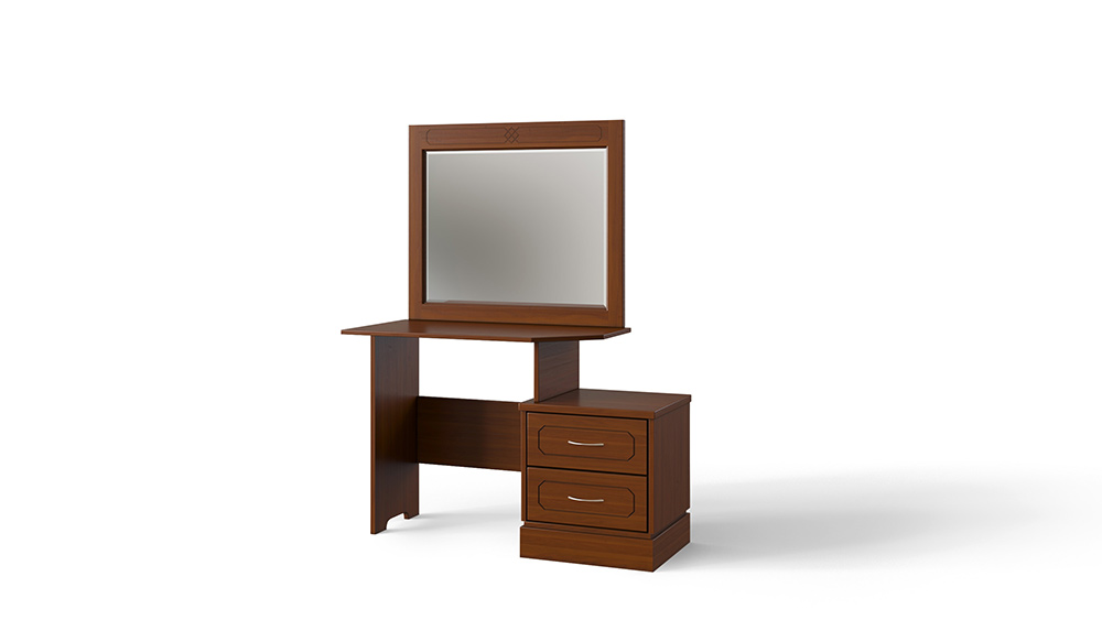 Туалетный стол выполненный в едином стиле коллекции мебели для спальни Варна - комлектуется зеркалом в багете из массива бука или ясеня. Стол обладает тумбой с двумя вместительными выкатными ящиками на телескопических направляющих. Сборка не требуется.