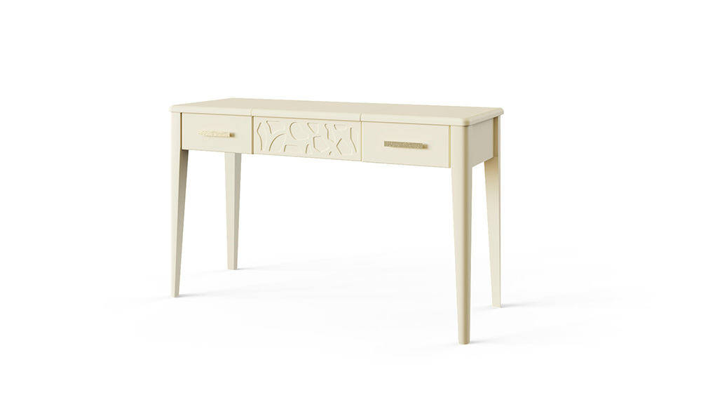 Компактный и красивый стол в котором все продумано до мелочей. Три ящика – помогут спрятать необходимые личные вещи. Два ящика по краям стола являются выкатными, а один ящик расположенный в центральной части стола открывается вверх. Неизменным остается наличие резьбы, «изысканной геометрии», которая и стала визитной карточкой всех мебельных изделий в коллекции спальни «Веро». В стандартном исполнении данный стол не комплектуется ручками на выдвижных ящиках, отверстия для крепления ручек так же отсутствует. Ручки и сверловка под них заказываются отдельно.