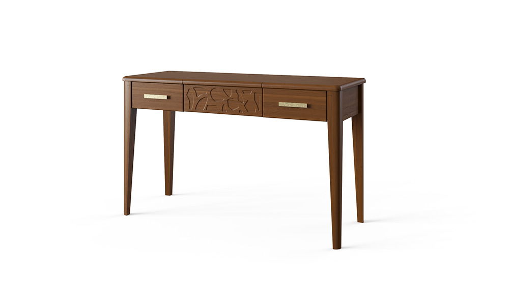 Компактный и красивый стол в котором все продумано до мелочей. Три ящика – помогут спрятать необходимые личные вещи. Два ящика по краям стола являются выкатными, а один ящик расположенный в центральной части стола открывается вверх. Неизменным остается наличие резьбы, «изысканной геометрии», которая и стала визитной карточкой всех мебельных изделий в коллекции спальни «Веро». В стандартном исполнении данный стол не комплектуется ручками на выдвижных ящиках, отверстия для крепления ручек так же отсутствует. Ручки и сверловка под них заказываются отдельно.