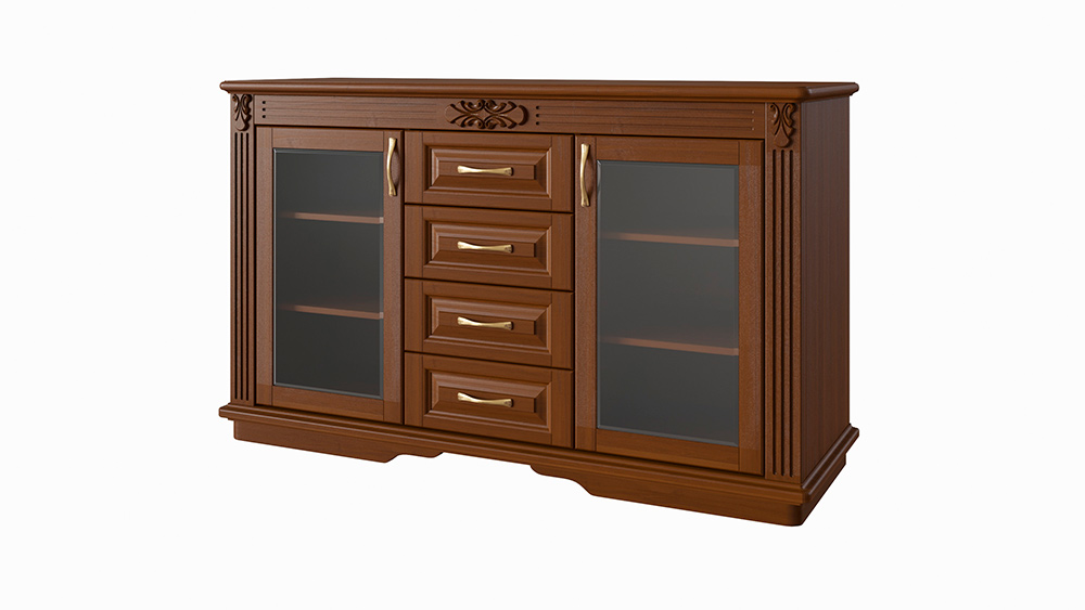 Комод Греденция Палермо на 4 ящика - это прообраз известных всем кабинета, серванта, комода и другой многофункциональной мебели. Эта мебель может быть изготовлена из массива бука или ясеня на Ваш выбор, в классическом стиле, идеально впишется в интерьер гостиной или кабинета, в ней удобно хранить, как небольшие предметы – для этого есть 4 выдвижных ящика, так и посуду – благодаря двум вместительным отсекам с полками за стекляными дверцами.