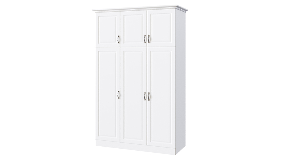 Классический шкаф, созданный в едином стиле с коллекцией Эдем — изделие без которого не возможно себе представить спальню. Корпус шкафа может быть изготовлен как из массива бука и ясеня, так и из массива мягколиственных пород, что делает его стоимость еще более демократичной. Трех створчатый шкаф имеет 3 базовые комплектации: c антресольной секцией в верхней (3-3) или нижней части (3-1) шкафа, или двумя выкатными ящиками (3-2) в нижней части шкафа. Стандартно двух створчатая секция шкафа располагается в правой части шкафа. Фасады шкафа могут иметь встроенные зеркала, как на лицевой части фасада — по размеру филенчатой части, так и на внутренней стороне фасада. Распашные дверцы шкафа оснащены петлями с системой до-закрытия в базовой комплектации. В большей секции шкафа предусмотрена штанга для плечиков, а в малой секции предусмотрены 3 полки для хранения вещей. По желанию шкаф может быть оснащен любым количеством полок.
