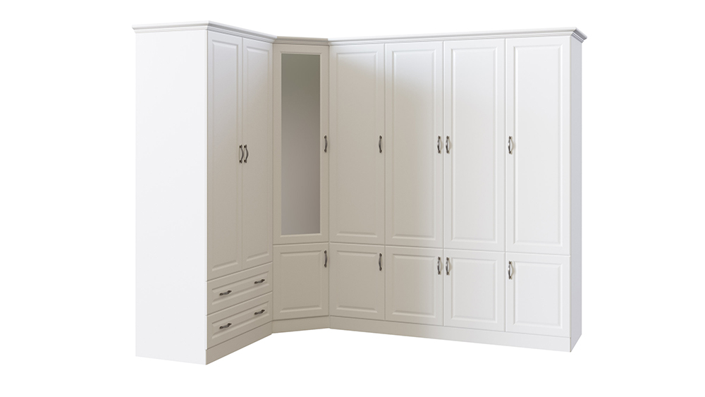 Малогабаритный и чревычайно вместительный шкаф, созданный в едином стиле с коллекцией Эдем. Корпус шкафа может быть изготовлен как из массива бука и ясеня, так и из массива мягколиственных пород, что делает его стоимость еще более демократичной. Угловой шкаф изготавливается в одной комплектации: c антресольной секцией в нижней части шкафа. Одностворчатый шкаф идеально подходит для составления мебельных композиций в качестве углового модульного элемента. На визуализации представлен пример вхождения углового шкафа в состав вместе с двухстворчатым и четырёхстворчатым шкафами из коллекции Эдем, объединёнными под единым карнизом вверху и цоколем внизу. Фасады шкафа могут иметь встроенные зеркала, как на лицевой части фасада — по размеру филенчатой части, так и на внутренней стороне фасада. Распашные дверцы шкафа оснащены петлями с системой дозакрытия в базовой комплектации. В большей секции шкафа предусмотрена штанга для плечиков. По желанию шкаф может быть оснащен любым количеством полок.