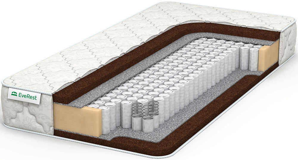 Жесткий пружинный матрас с наполнителем одного вида — койрой кокоса. Относится к моделям с ортопедическими эффектами. Популярный блок TFK состоит из 250 пр./кв.м.. В его основе лежат самые прочные пружины с сечением стальной проволоки 1,8 мм. Анатомические свойства матраса связаны со способностью пружин точечно реагировать на нагрузку, повторять изгибы тела. Жесткость и ортопедические свойства модели придают кокосовые настилы 3 см толщиной. Это натуральный наполнитель, пропитанный латексом для скрепления волокон кокоса и повышения его пластичности. От пружин койра защищена войлоком. Чехол хлопковый жаккард, стеганный - 200 гр. синтепона.