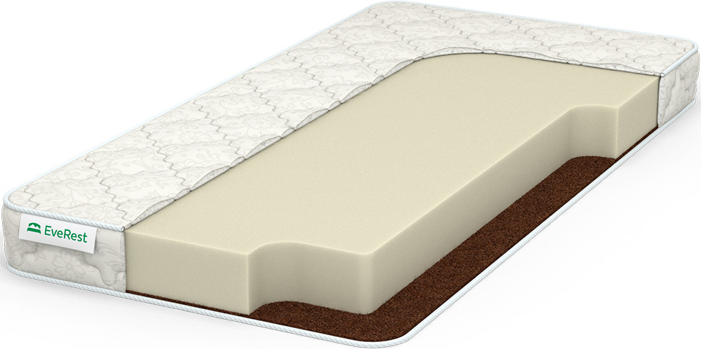 Беспружинный матрас сочетает наполнители двух видов: природную койру и пенополиуретан. Модель разносторонней жесткости высотой 15 см. Монолит пенополиуретана толщиной 14 см лежит в основе матраса. Он изготовлен из высокоэластичного полиэфира по технологии вспенивания. Благодаря своей структуре обладает упругостью и воздухопроницаемостью. Обеспечивает умеренную жесткость одной из спальных поверхностей. Плита койры кокоса, для повышения эластичности пропитанная латексом, придает жесткость второму спальному месту. Матрас не вызывает аллергии, поглощает вибрацию и обеспечивает комфортный сон. Чехол выполнен из жаккарда.
