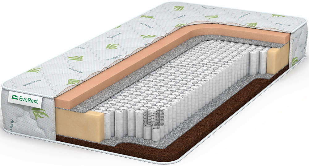 Пружинный анатомический матрас включает наполнители двух видов: жесткую натуральную койру и мягкий меморикс, обеспечивающих разностороннюю жесткость спальных поверхностей. Основа модели — блок MultiPocket из микропружин (500 пр./кв.м). Каждая из них упакована в индивидуальные чехлы. Глубокий сон и комфорт обеспечивает самый мягкий из всех наполнителей — меморикс. Толщина настила — 4 см. Это пенополиуретан с особыми добавками. В нем тело как бы парит. На жесткой стороне уложена трехсантиметровая по толщине плита койры. За счет такого наполнителя нагрузка равномерно распределена по спальной поверхности. Наполнители защищены войлоком от истирания пружинами. Трикотажный чехол защищен от бактерий составом Aloe Vera.