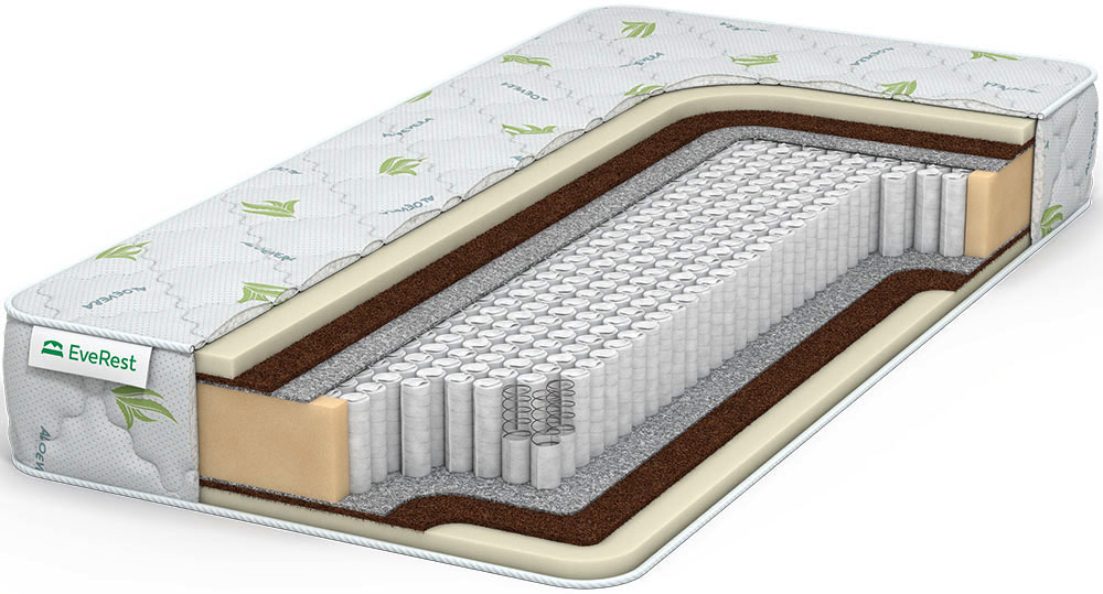 Пружинный матрас с ортопедическими свойствами относится к моделям средней жесткости. В качестве наполнителя в нем использована натуральная койра и искусственный латекс. В основе модели лежит блок микропружин MultiPocket S1000, включающий 500 элементов на квадратный метр. Каждая из них упакована в индивидуальные чехлы. Пружины не связаны между собой и точечно реагируют на нагрузку. Жесткость матрасу обеспечивает койра кокоса, изолированная от пружин войлоком. Умеренную мягкость спальному месту с двух сторон обеспечивает искусственный латекс, устойчивый к деформации. Чехол выполнен из прочного смесового трикотажа с антисептической пропиткой AloeVera.