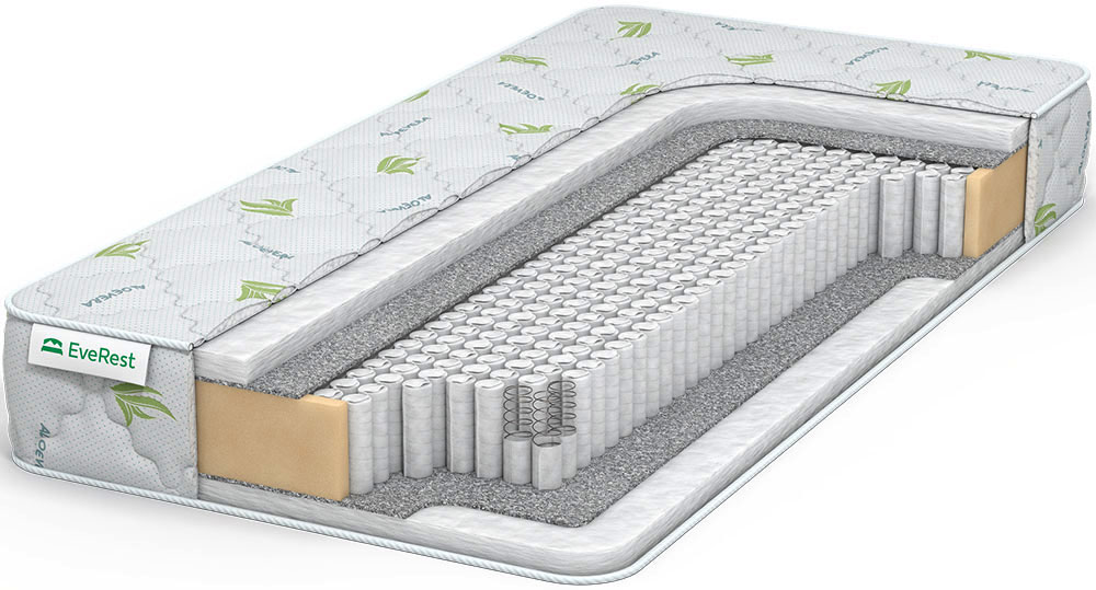 Пружинный матрас с ортопедическими свойствами средней жесткости с наполнителем из холофайбера. Основа модели — блок MultiPocket S1000 из адаптивных микропружин, точечно реагирующий на нагрузки. К основным свойствам блока можно отнести: - не создает «эффекта гамака»; - подстраивается под контуры тела; - бесшумен; - обеспечивает комфортный сон. На спальных поверхностях уложен настил из холофайбера 3 см толщиной. Это нетканый материал из вертикальных волокон полиэстера, закрученных подобно пружинам, что обеспечивает материалу упругость. От истирания пружинами он защищен войлоком. Чехол матраса изготовлен из смесового трикотажа, пропитанного антисептическим составом AloeVera.