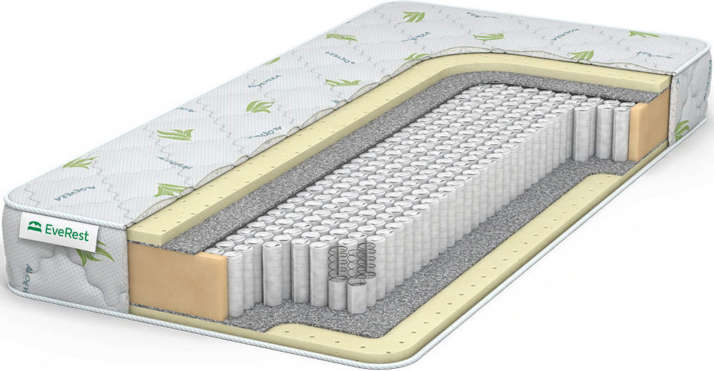 Умеренно-мягкий пружинный матрас включает натуральный наполнитель — латекс, изолированный войлоком от пружин. Относится к моделям с ортопедическим эффектом. В основе лежит блок из микропружин MultiPocket (500 пр./кв.м), упакованных в индивидуальные чехлы. Толщина проволоки — 1,3 мм. За счет большого количества пружин матрас повторяет изгибы тела, точечно реагирует на нагрузку и выдерживает большие нагрузки. Настилы природного латекса толщиной 2 см с двух спальных сторон придают модели мягкость. Сквозная перфорация обеспечивает свободный воздухообмен. Чехол из трикотажа пропитан специальным составом Aloe Vera — экстрактом с антисептическими свойствами, и простеган на холконе.