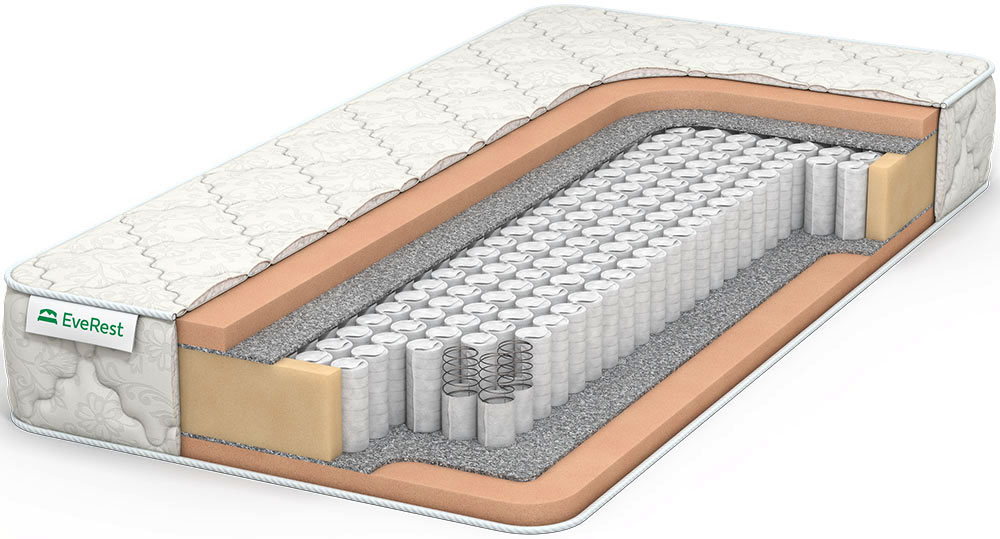 Анатомические свойства матраса обеспечены популярным блоком TFK. В его основе лежат самые прочные пружины, с сечением стальной проволоки 2 мм. Плотность их размещения — 250 пр./кв.м.